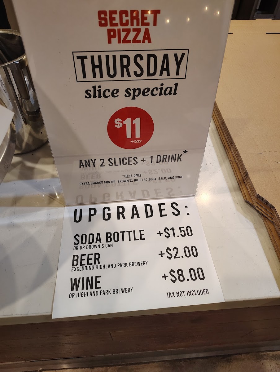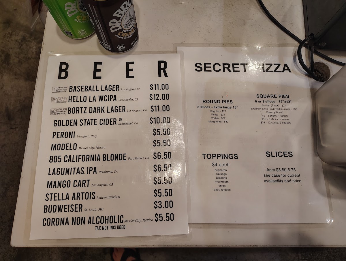 As a reviewer wrapping up my thoughts on the menu at Secret Pizza, I’d describe it as a concise yet character-driven selection that stays true to comfort, balance, and approachability. The heart of the menu clearly lies in its square pies, where options like Sigilian Thick, Vodka Thick, and Cheezy Bro highlight a focus on hearty textures, bold cheese presence, and classic Italian-American flavor profiles. These pizzas feel designed for sharing, satisfying, and pairing easily with drinks rather than overwhelming diners with endless variations. Complementing the food is a straightforward but thoughtful beverage lineup. The beer selection-featuring Baseball Lager, Hello La Wcipa, Bortz Dark Lager, Golden State Cider, and Peroni-covers a wide spectrum from crisp and refreshing to deeper, malt-forward notes, making it easy to find a drink that matches your mood or your slice. For those not in the mood for beer, the “Others” category keeps things flexible and inclusive, offering Sparkling White, Soda Bottle, BeerWine, and BeerWine, ensuring that both casual and social diners feel catered to. Overall, the menu doesn’t try to be flashy or overly complex; instead, it succeeds by focusing on a small number of well-chosen items that work harmoniously together. This makes Secret Pizza’s menu feel cohesive and confident, serving as a fitting conclusion to the dining experience-simple, satisfying, and memorable without trying too hard.